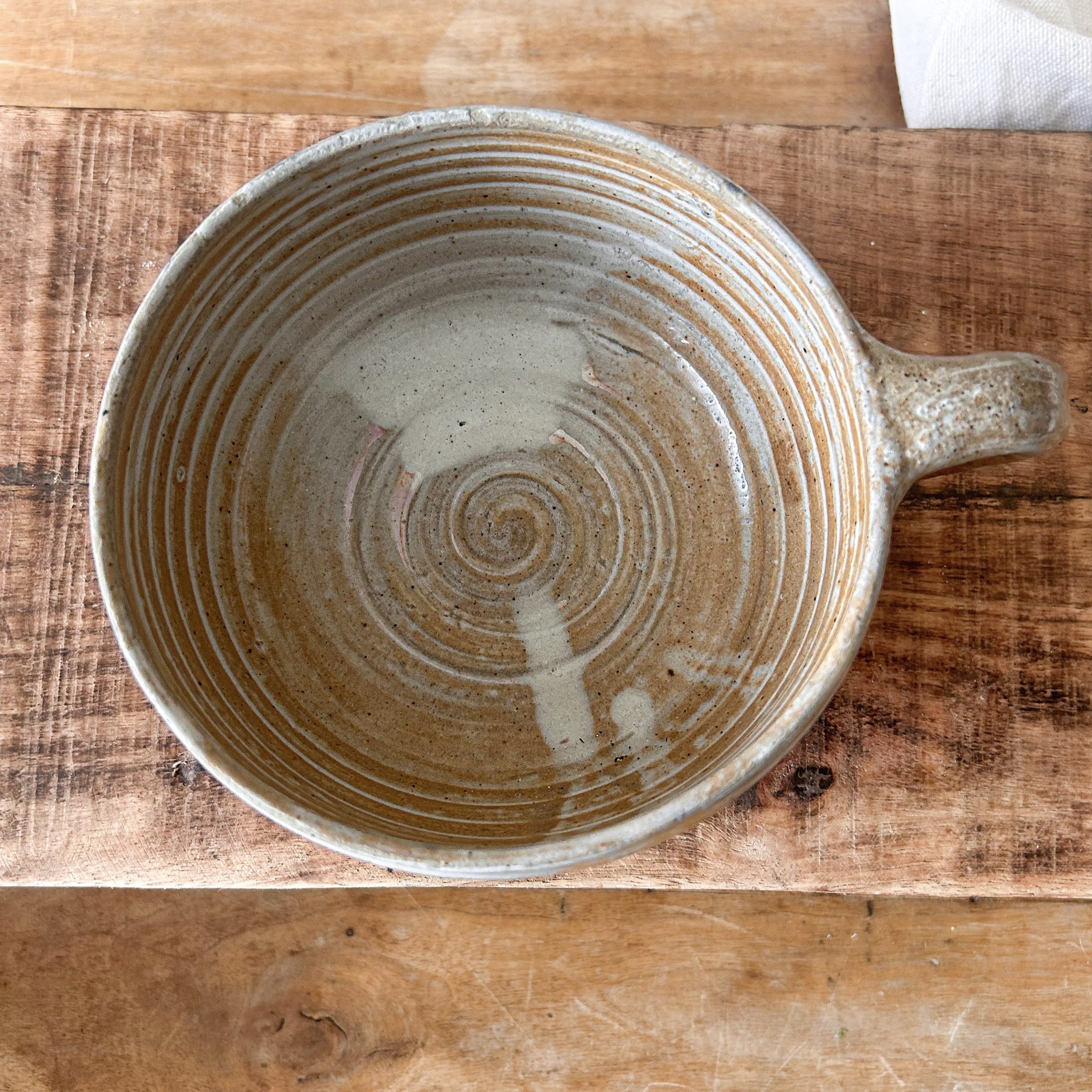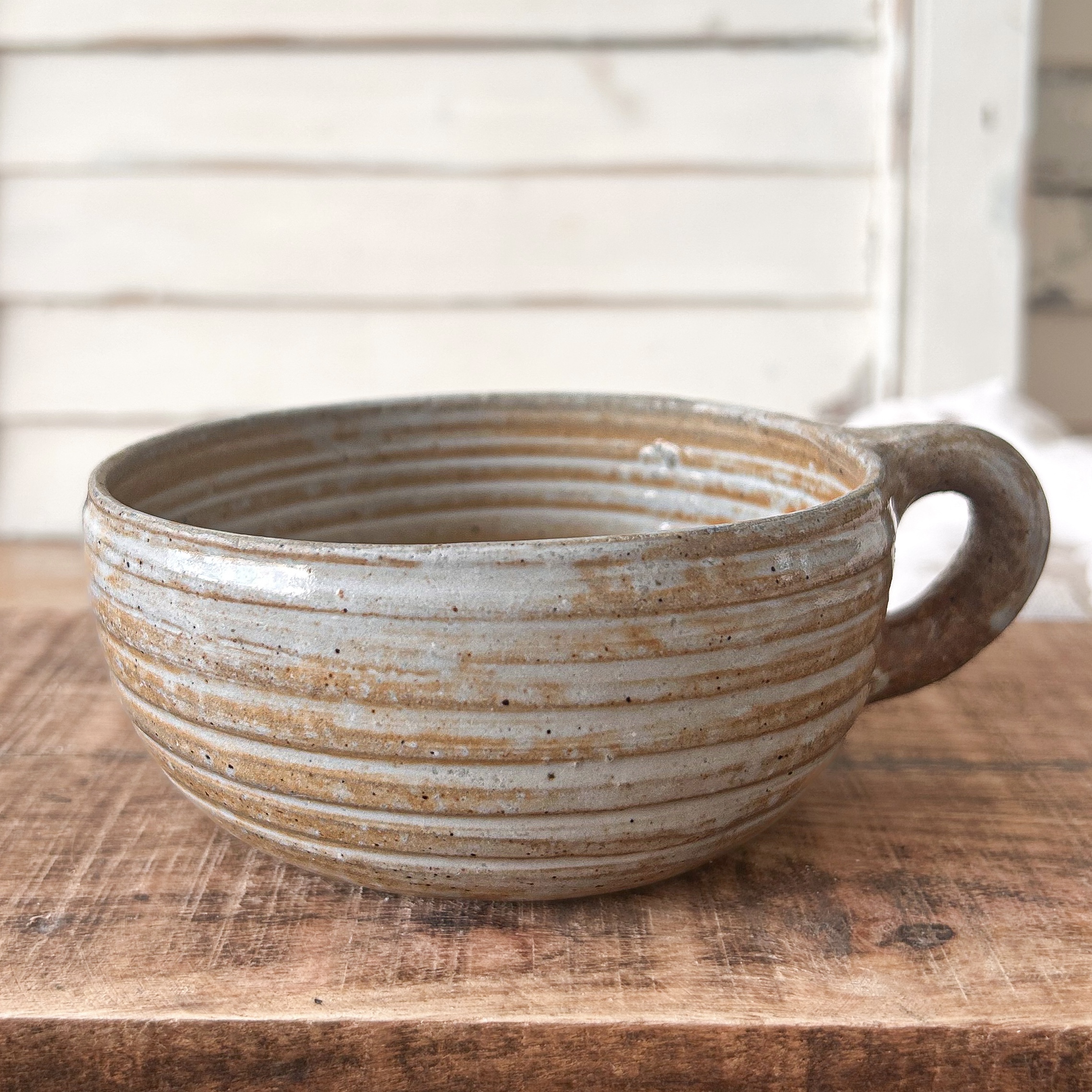 Clarence, c’est un bol qui tient dans la main comme un secret bien gardé. En grès strié, au fini mat légèrement moucheté de beige et de brun, il offre une douceur visuelle qui réchauffe dès le matin. Son anse pleine de caractère rappelle une tasse rustique, mais c’est bien un bol qui aime prendre son temps.