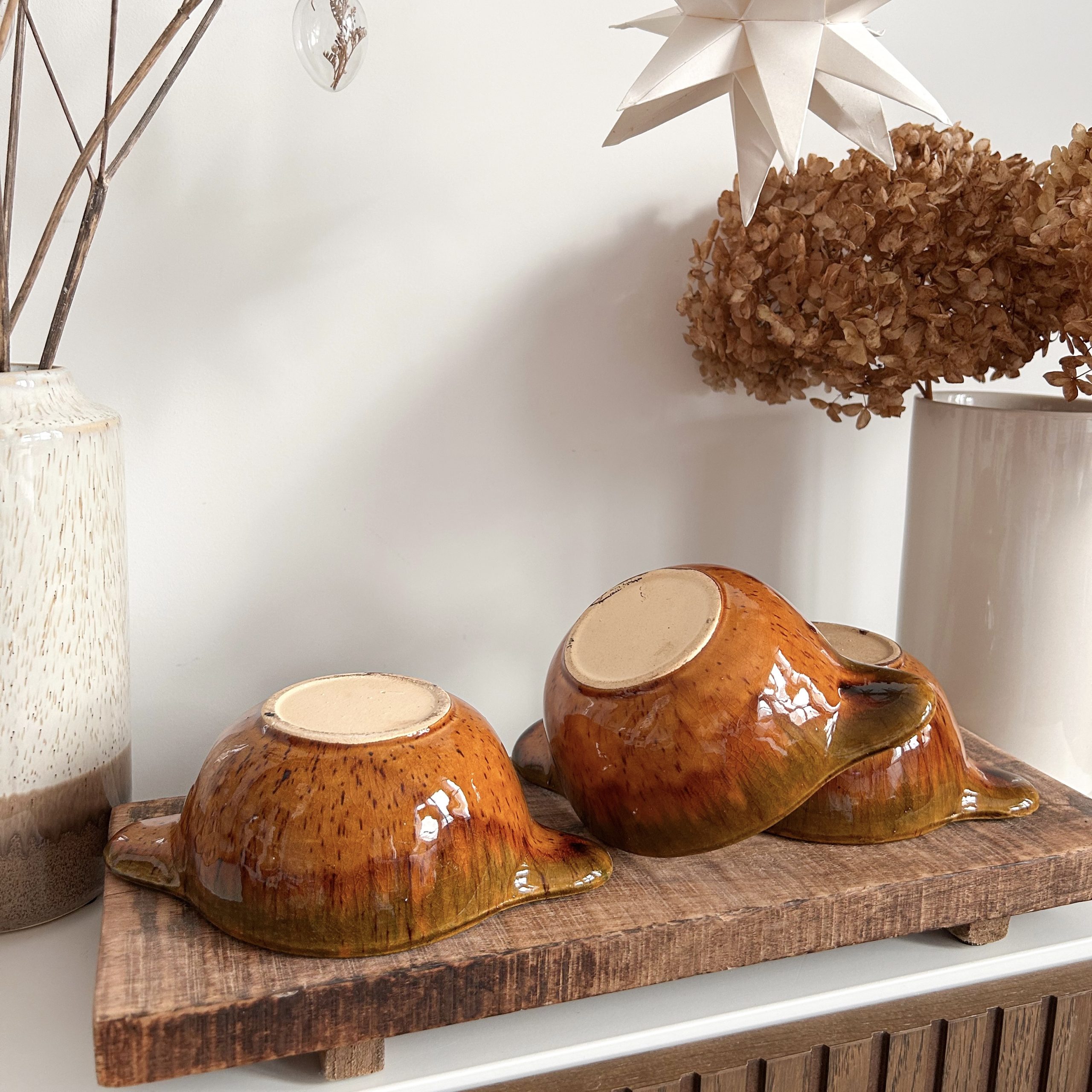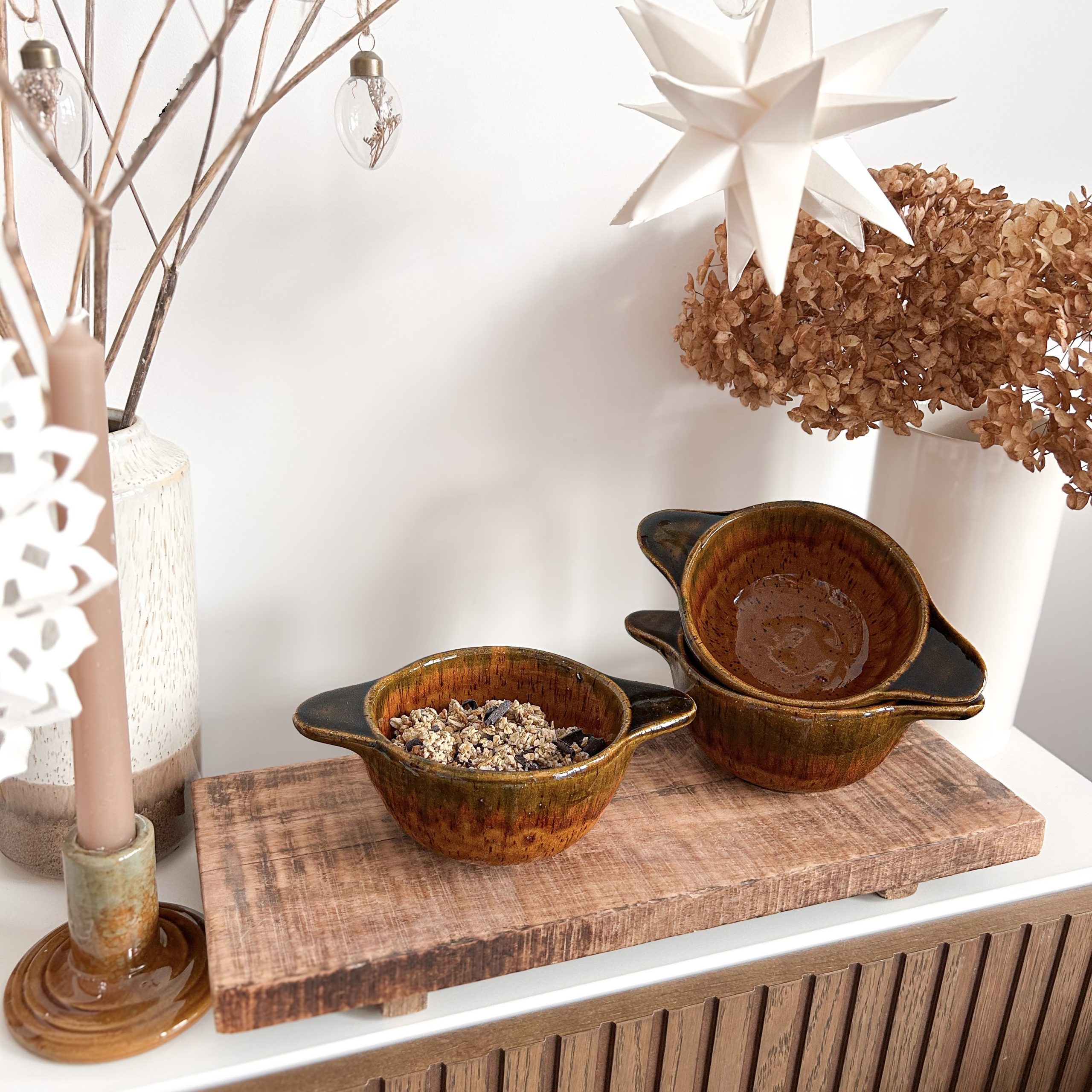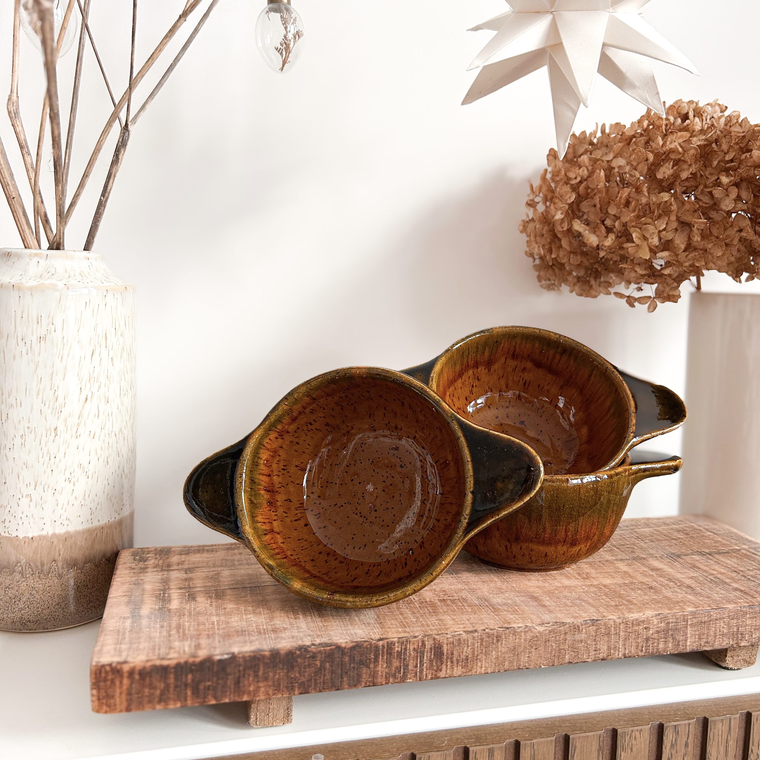 • Céramique aux reflets envoûtants : Un jeu de nuances naturelles, entre ocre et caramel, qui fait de chaque bol une pièce unique.