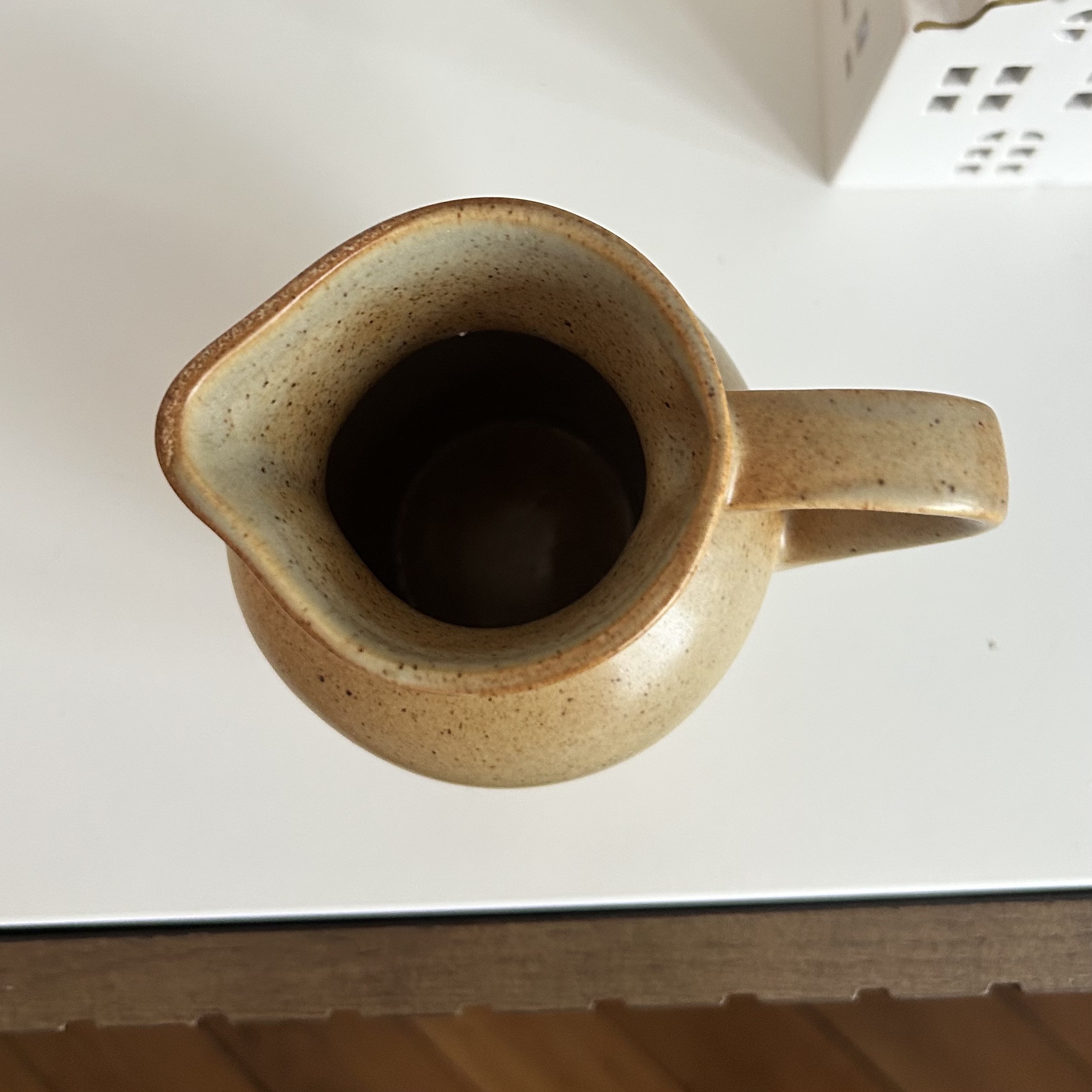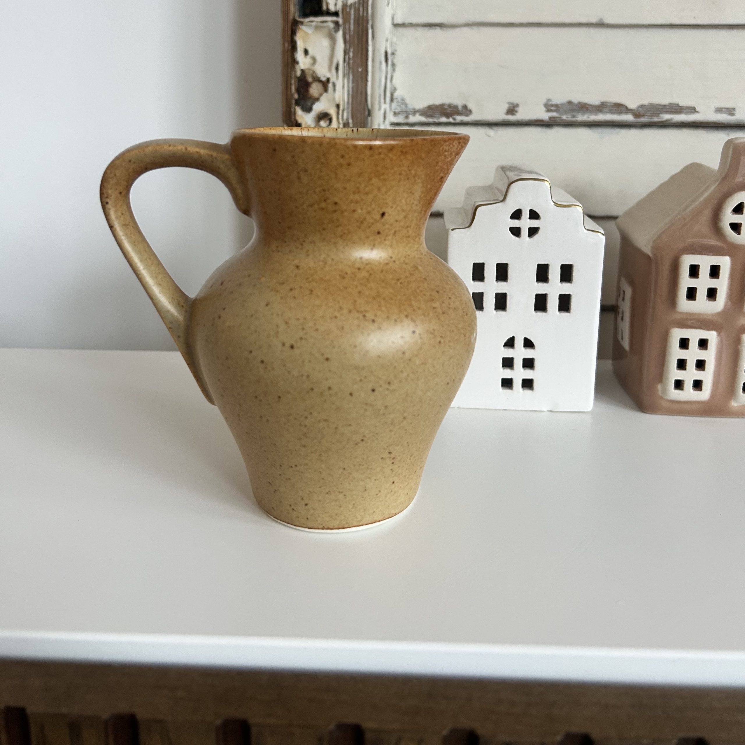 • Un petit pichet façonné avec simplicité : Sa couleur sable légèrement tachetée lui donne un charme naturel, comme si la terre dont il est issu avait gardé la mémoire des champs.